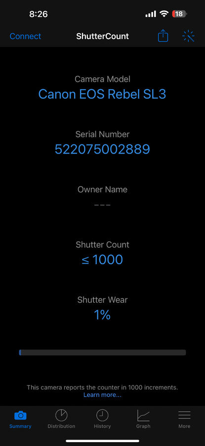 This camera was used by a non-smoker and stored in a non-smoking household. This camera reports shutter usage in increments of 1,000 and reports under 1,000 clicks. It has two protective accessories installed: a back screen protector and a silicon case to protect the display and body, respectively.