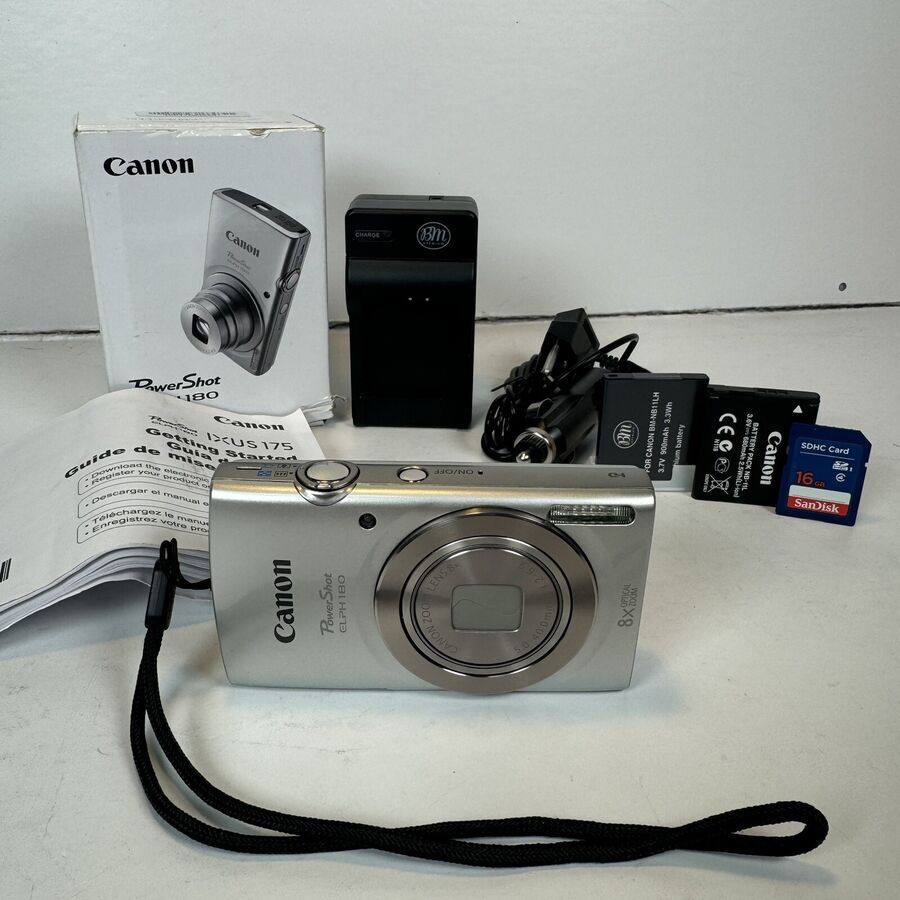 Canon PowerShot ELPH 180 20MP Digital Camera comes with a new Non OEM Charger and 2 Batteries. The camera is in like new / mint condition, appearing to have been rarely used. It has been tested and functions properly. Included with the camera are the guide booklet, original box, original battery, a new aftermarket battery, aftermarket charger, and a 16 GB memory card. The original battery charges well, though the duration of its charge was not tested. This item comes from a smoke-free home.